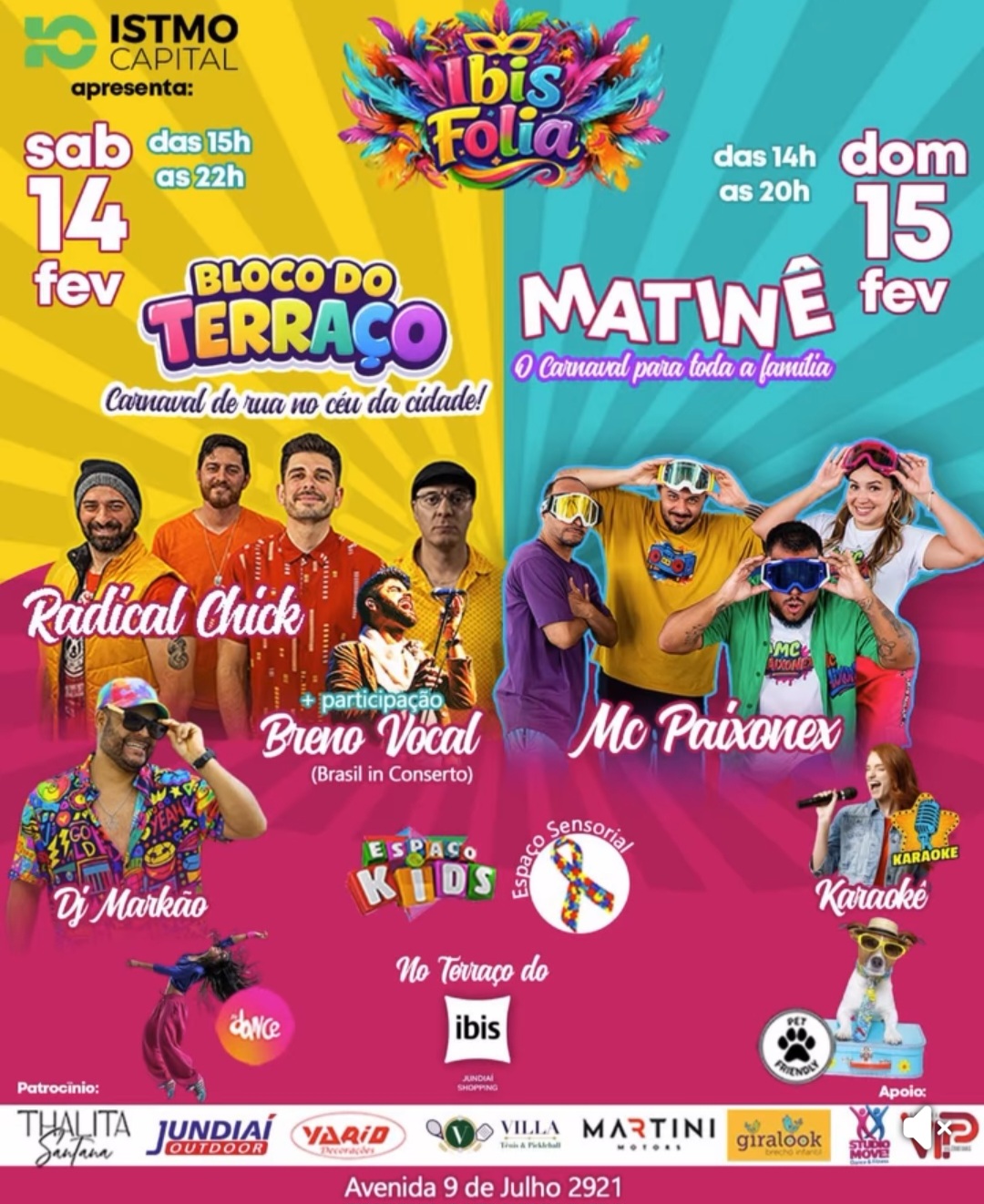 ​No domingo (15/02), o foco muda para o público familiar com a Matinê. A grande atração é a estreia do MC Paixonex em Jundiaí, focado no público infantil. Enquanto as crianças aproveitam os brinquedos e o show, os adultos contam com um segundo ambiente dedicado às marchinhas e sucessos de Carnaval.